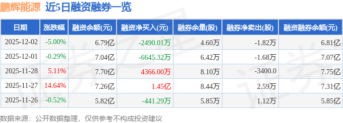 鹏辉能源融资融券信息显示,融资方面,当日融资买入1.47亿元,融资偿还1.72亿元,融资净偿还2490.01万元。融券方面,融券卖出7700.0股,融券偿还2.59万股,融券余量4.6万股,融券余额252.82万元。融资融券余额6.81亿元。