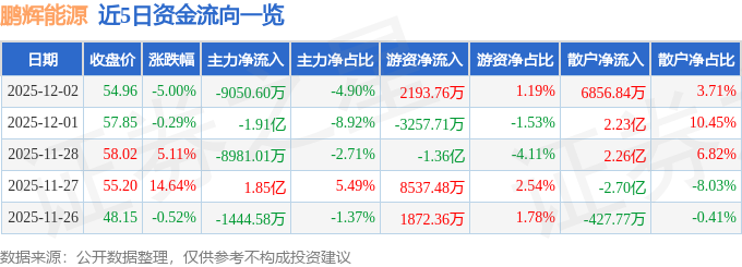 证券之星消息,截至2025年12月2日收盘,鹏辉能源(300438)报收于54.96元,下跌5.0%,换手率8.22%,成交量33.22万手,成交额18.48亿元。