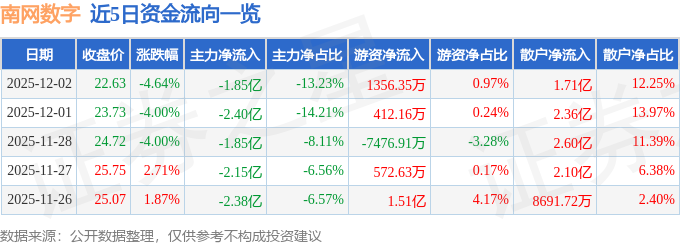 证券之星消息,截至2025年12月2日收盘,南网数字(301638)报收于22.63元,下跌4.64%,换手率25.96%,成交量60.99万手,成交额13.95亿元。