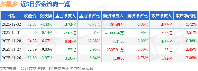证券之星消息,截至2025年12月2日收盘,多氟多(002407)报收于32.97元,下跌4.43%,换手率12.13%,成交量131.04万手,成交额43.4亿元。
