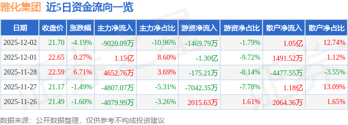 证券之星消息,截至2025年12月2日收盘,雅化集团(002497)报收于21.7元,下跌4.19%,换手率3.55%,成交量37.59万手,成交额8.23亿元。