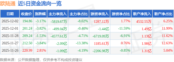 证券之星消息,截至2025年12月2日收盘,欧陆通(300870)报收于194.86元,下跌3.17%,换手率3.37%,成交量3.7万手,成交额7.26亿元。