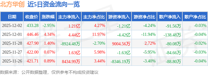 证券之星消息,截至2025年12月2日收盘,北方华创(002371)报收于433.28元,下跌2.95%,换手率0.9%,成交量6.52万手,成交额28.44亿元。