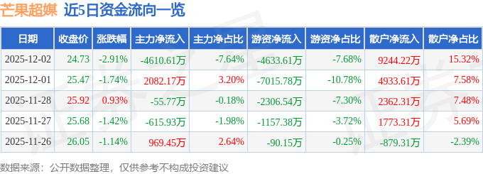 证券之星消息,截至2025年12月2日收盘,芒果超媒(300413)报收于24.73元,下跌2.91%,换手率2.38%,成交量24.28万手,成交额6.03亿元。