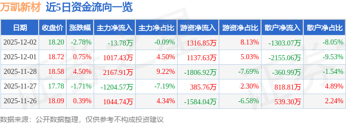 证券之星消息,截至2025年12月2日收盘,万凯新材(301216)报收于18.2元,下跌2.78%,换手率1.61%,成交量8.82万手,成交额1.62亿元。