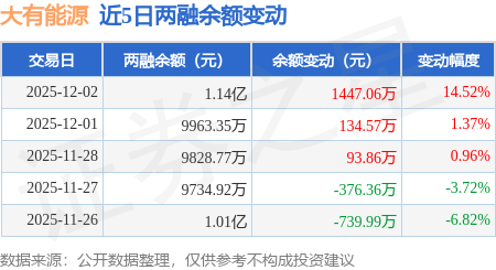 证券之星消息,12月2日,大有能源(600403)融资买入5217.81万元,融资偿还3761.16万元,融资净买入1456.65万元,融资余额1.13亿元,近3个交易日已连续净买入累计1684.71万元。