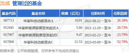 沈成先生:中国,上海交通大学技术经济及管理专业硕士,硕士研究生学历。曾先后任职于长城证券股份有限公司、中泰证券股份有限公司、中银国际证券股份有限公司。2021年11月26日加入华富基金管理有限公司,现任华富新能源股票型发起式证券投资基金的基金经理。2021年12月29日起任华富新能源股票型发起式证券投资基金基金经理。2022年8月22日起任华富科技动能混合型证券投资基金基金经理。