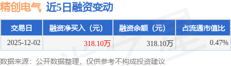证券之星消息,12月2日,精创电气(920035)融资买入380.96万元,融资偿还62.86万元,融资净买入318.1万元,融资余额318.1万元。