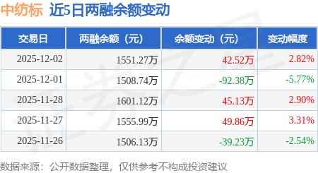 证券之星消息,12月2日,中纺标(920122)融资买入76.28万元,融资偿还33.76万元,融资净买入42.52万元,融资余额1551.27万元。