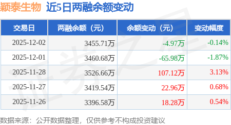 证券之星消息,12月2日,颖泰生物(920819)融资买入33.55万元,融资偿还38.52万元,融资净卖出4.97万元,融资余额3455.71万元,近20个交易日中有12个交易日出现融资净买入。
