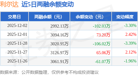 证券之星消息,12月2日,利尔达(920249)融资买入253.76万元,融资偿还355.79万元,融资净卖出102.03万元,融资余额2992.13万元,近20个交易日中有12个交易日出现融资净买入。