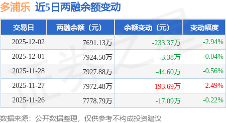 证券之星消息,12月2日,多浦乐(301528)融资买入301.49万元,融资偿还534.86万元,融资净卖出233.37万元,融资余额7691.13万元,近20个交易日中有11个交易日出现融资净买入。
