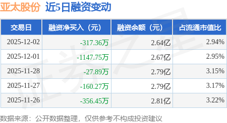 证券之星消息,12月2日,亚太股份(002284)融资买入395.49万元,融资偿还712.85万元,融资净卖出317.36万元,融资余额2.64亿元。