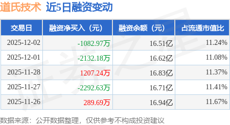 证券之星消息,12月2日,道氏技术(300409)融资买入5082.84万元,融资偿还6165.81万元,融资净卖出1082.97万元,融资余额16.51亿元。
