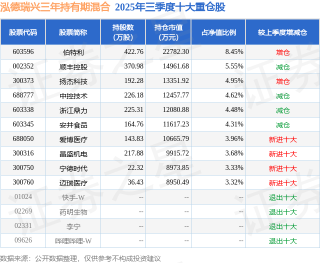 泓德瑞兴三年持有期混合的前十大重仓股如下:
