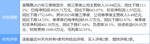 2025年9月14日,天风证券研究员张潇倩,谢文旭发布了对香飘飘的研报《H1即饮板块贡献核心业绩,全年业绩预计以稳为主》,该研报对香飘飘给出“买入”评级。研报中预计公司25-27年归母净利润分别为2.6/2.8/3.0亿元(前值2.7/3.1/3.4亿元),维持“买入”评级。证券之星数据中心根据近三年发布的研报数据计算,该研报作者对此股的盈利预测准确度为61.9%。