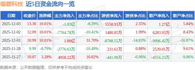 证券之星消息,截至2025年12月3日收盘,福蓉科技(603327)报收于13.3元,上涨10.01%,已连续涨停3天,换手率16.81%,成交量167.72万手,成交额21.82亿元。