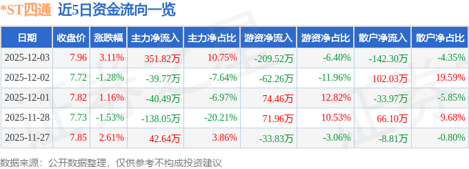 证券之星消息,截至2025年12月3日收盘,*ST四通(603838)报收于7.96元,上涨3.11%,换手率1.27%,成交量4.06万手,成交额3271.41万元。