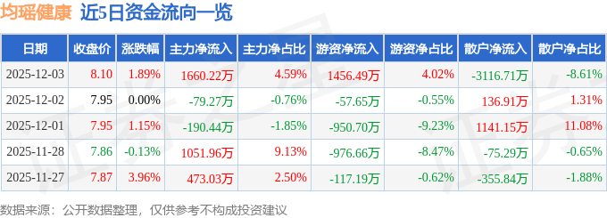 证券之星消息,截至2025年12月3日收盘,均瑶健康(605388)报收于8.1元,上涨1.89%,换手率7.44%,成交量44.7万手,成交额3.62亿元。