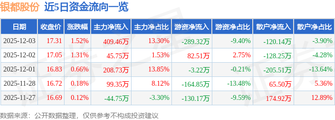 12月3日的资金流向数据方面,主力资金净流入409.46万元,占总成交额13.3%,游资资金净流出289.32万元,占总成交额9.4%,散户资金净流出120.14万元,占总成交额3.9%。