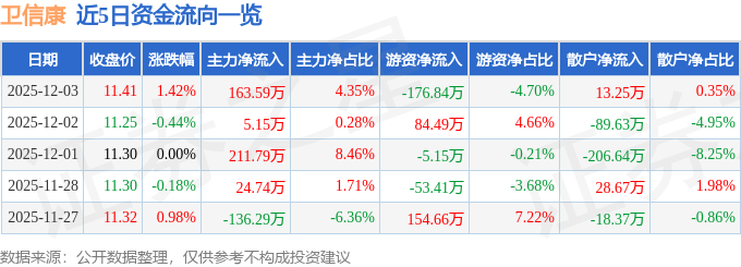 证券之星消息,截至2025年12月3日收盘,卫信康(603676)报收于11.41元,上涨1.42%,换手率0.76%,成交量3.3万手,成交额3765.09万元。