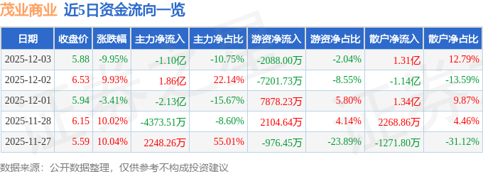 证券之星消息,截至2025年12月3日收盘,茂业商业(600828)报收于5.88元,下跌9.95%,换手率9.74%,成交量168.67万手,成交额10.22亿元。