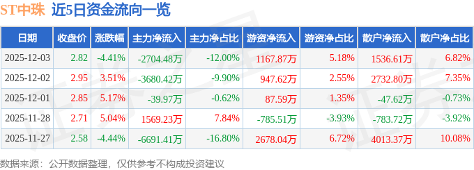 证券之星消息,截至2025年12月3日收盘,ST中珠(600568)报收于2.82元,下跌4.41%,换手率4.72%,成交量78.82万手,成交额2.25亿元。