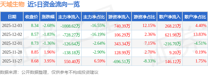 证券之星消息,截至2025年12月3日收盘,天域生物(603717)报收于8.34元,下跌2.68%,换手率2.5%,成交量7.26万手,成交额6093.95万元。