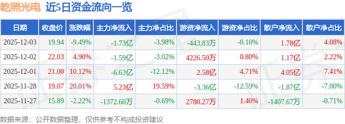 证券之星消息,截至2025年12月3日收盘,乾照光电(300102)报收于19.94元,下跌9.49%,换手率23.27%,成交量213.2万手,成交额43.6亿元。