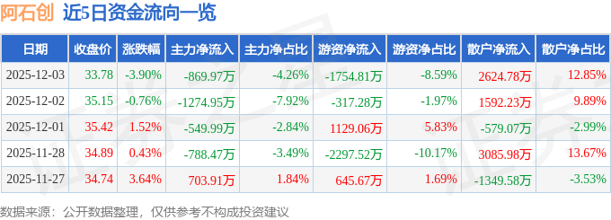 证券之星消息,截至2025年12月3日收盘,阿石创(300706)报收于33.78元,下跌3.9%,换手率5.29%,成交量6.01万手,成交额2.04亿元。