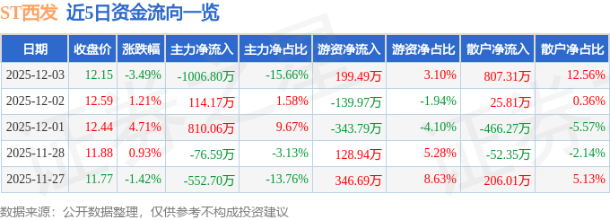证券之星消息,截至2025年12月3日收盘,ST西发(000752)报收于12.15元,下跌3.49%,换手率1.99%,成交量5.26万手,成交额6429.41万元。