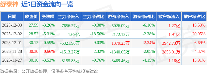 证券之星消息,截至2025年12月3日收盘,舒泰神(300204)报收于27.59元,下跌3.26%,换手率6.49%,成交量29.42万手,成交额8.16亿元。