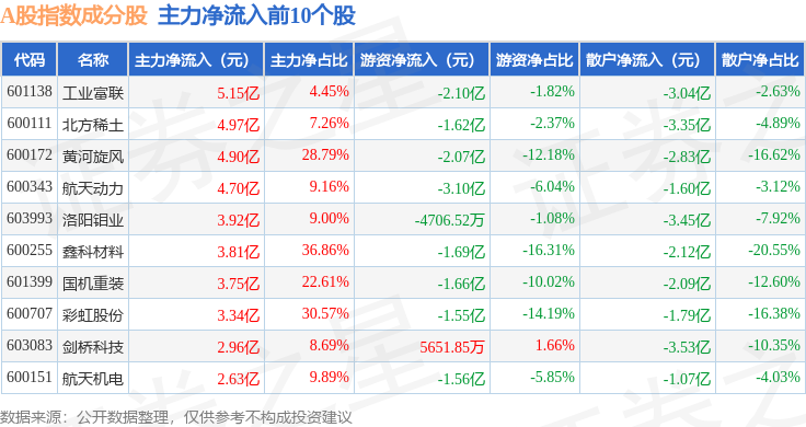 资金流向方面,A股指数(000002)成份股当日主力资金净流出合计243.73亿元,游资资金净流入合计47.66亿元,散户资金净流入合计196.07亿元。成份股资金流向详情见下表: