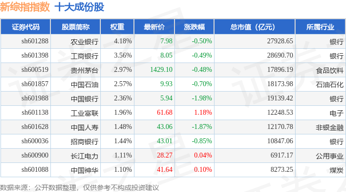 证券之星消息,12月3日,新综指(000017)指数报收于3277.96点,跌0.51%,成交6367.77亿元,换手率1.01%。当日该指数成份股中,上涨的有663家,金迪克以15.93%的涨幅领涨,下跌的有1468家,合富中国以10.02%的跌幅领跌。