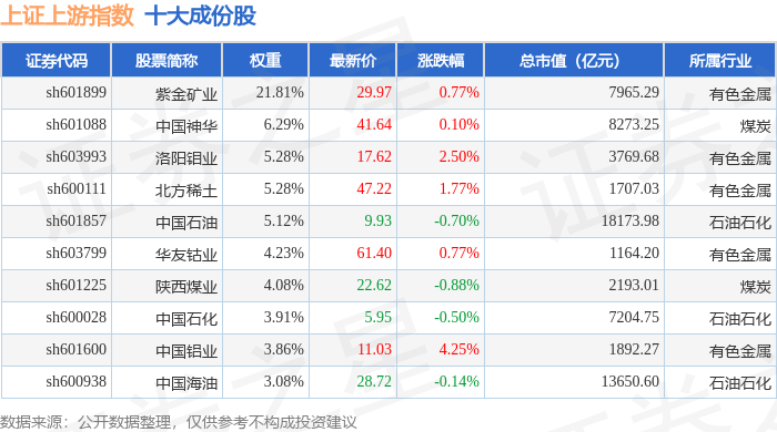 证券之星消息,12月3日,上证上游(000094)指数报收于4250.59点,涨0.49%,成交465.04亿元,换手率0.61%。当日该指数成份股中,上涨的有23家,中国铝业以4.25%的涨幅领涨,下跌的有21家,赤峰黄金以2.31%的跌幅领跌。