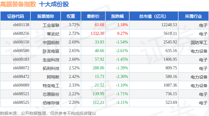 证券之星消息,12月3日,高端装备(000097)指数报收于10773.97点,跌1.04%,成交852.93亿元,换手率1.02%。当日该指数成份股中,上涨的有12家,赛轮轮胎以2.2%的涨幅领涨,下跌的有47家,传音控股以8.23%的跌幅领跌。