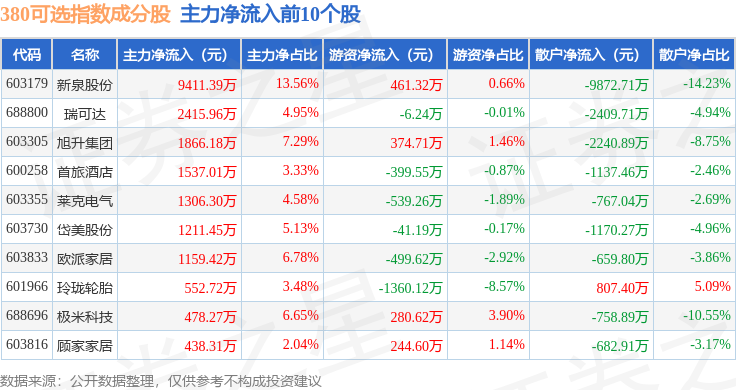 资金流向方面,380可选(000107)指数成份股当日主力资金净流出合计1.43亿元,游资资金净流出合计8021.17万元,散户资金净流入合计2.23亿元。成份股资金流向详情见下表: