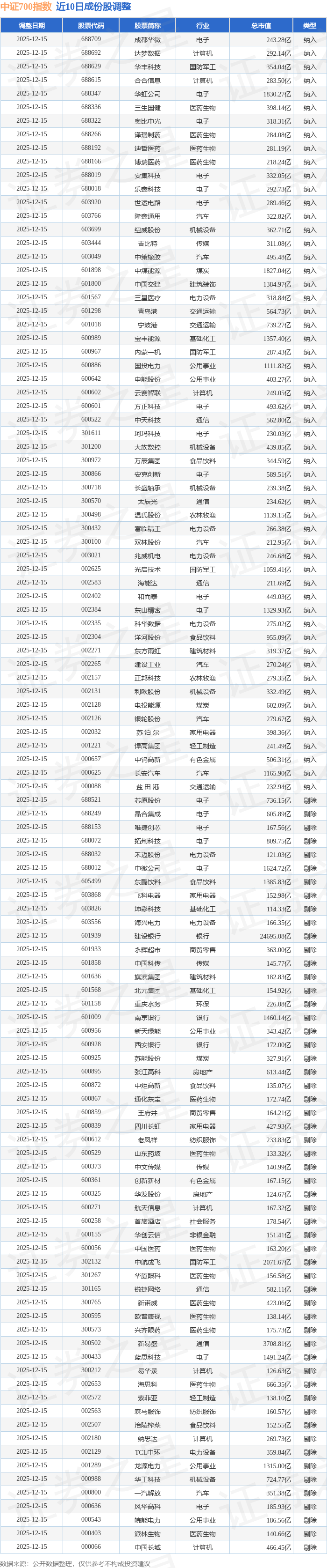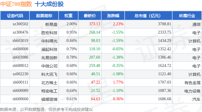 中证700(000907)指数十大成份股详情如下: