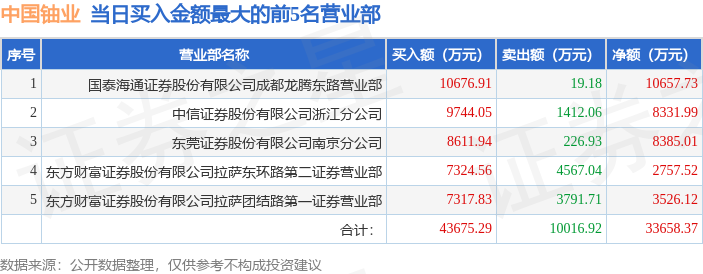 证券之星消息,沪深交易所2025年12月3日公布的交易公开信息显示,中国铀业(001280)因无价格涨跌幅限制的证券登上龙虎榜。此次是近5个交易日内第1次上榜。