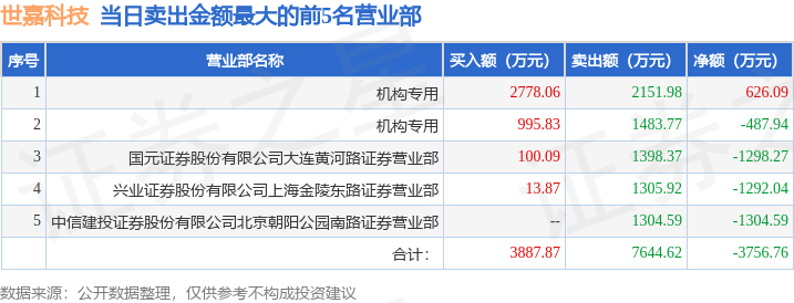 证券之星消息,沪深交易所2025年12月3日公布的交易公开信息显示,世嘉科技(002796)因日跌幅偏离值达到7%的前5只证券登上龙虎榜。此次是近5个交易日内第1次上榜。