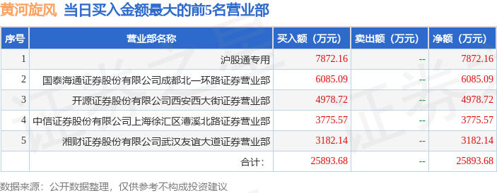 证券之星消息,沪深交易所2025年12月3日公布的交易公开信息显示,黄河旋风(600172)因有价格涨跌幅限制的日收盘价格涨幅偏离值达到7%的前五只证券登上龙虎榜。此次是近5个交易日内第1次上榜。
