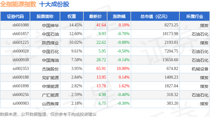 全指能源(000986)指数十大成份股详情如下: