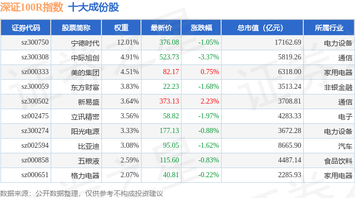 深证100R(399004)指数十大成份股详情如下: