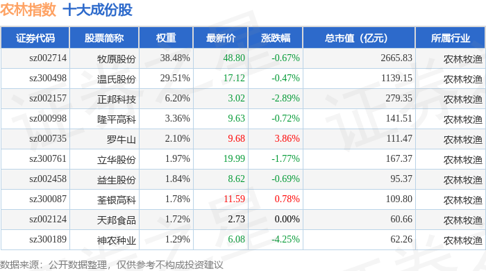 资金流向方面,农林指数(399231)成份股当日主力资金净流入合计891.77万元,游资资金净流出合计1.05亿元,散户资金净流入合计9637.45万元。成份股资金流向详情见下表:
