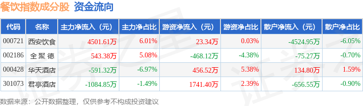 资金流向方面,餐饮指数(399238)成份股当日主力资金净流入合计3368.81万元,游资资金净流入合计1753.15万元,散户资金净流出合计5121.96万元。成份股资金流向详情见下表: