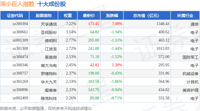 证券之星消息,12月3日,深小巨人(399268)指数报收于1932.16点,涨0.09%,成交633.18亿元,换手率4.86%。当日该指数成份股中,上涨的有30家,上海瀚讯以10.03%的涨幅领涨,下跌的有70家,润欣科技以6.16%的跌幅领跌。