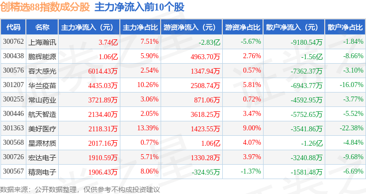 资金流向方面,创精选88(399291)指数成份股当日主力资金净流出合计35.34亿元,游资资金净流入合计9.63亿元,散户资金净流入合计25.71亿元。成份股资金流向详情见下表: