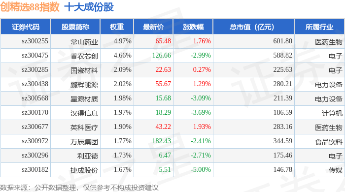 创精选88(399291)指数十大成份股详情如下: