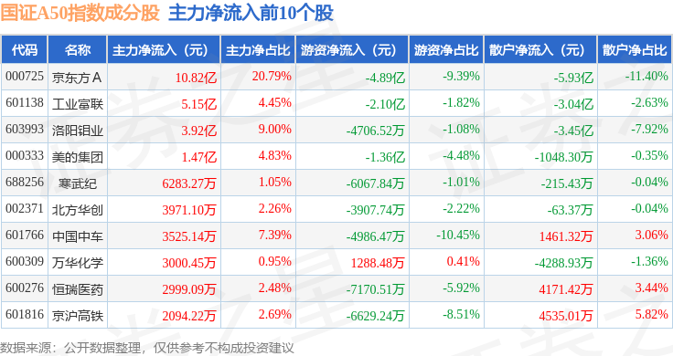 资金流向方面,国证A50(399310)指数成份股当日主力资金净流出合计75.15亿元,游资资金净流入合计34.1亿元,散户资金净流入合计41.06亿元。成份股资金流向详情见下表: