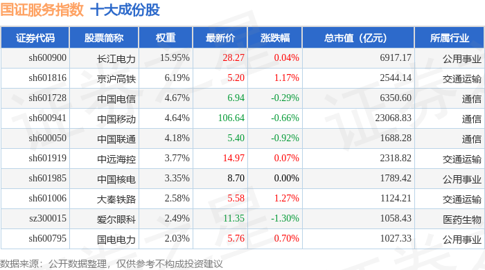证券之星消息,12月3日,国证服务(399320)指数报收于2187.79点,涨0.19%,成交284.01亿元,换手率0.51%。当日该指数成份股中,上涨的有62家,厦门象屿以3.69%的涨幅领涨,下跌的有34家,上海电力以4.84%的跌幅领跌。